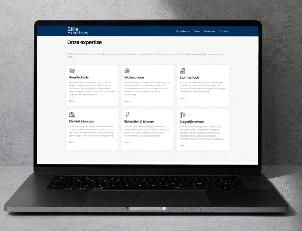 Gillis Expertises is een betrouwbare partner in tegenexpertises over heel België. Voor dit project namen we de volledige website onder handen, van design en development tot SEO-optimalisatie en Google Business-profiel. We creëerden een moderne, overzichtelijke site die het professionele karakter van het bedrijf weerspiegelt en vertrouwen uitstraalt. De website werd volledig uitgewerkt in twee talen (Nederlands en Frans), zodat klanten in heel het land makkelijk de juiste informatie vinden. Dankzij de sterke online basis en geoptimaliseerde zoekwoordenstructuur is Gillis Expertises nu beter vindbaar én herkenbaar in zoekresultaten.