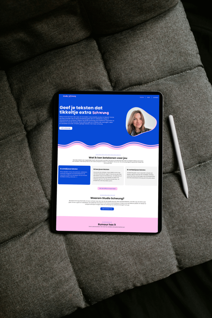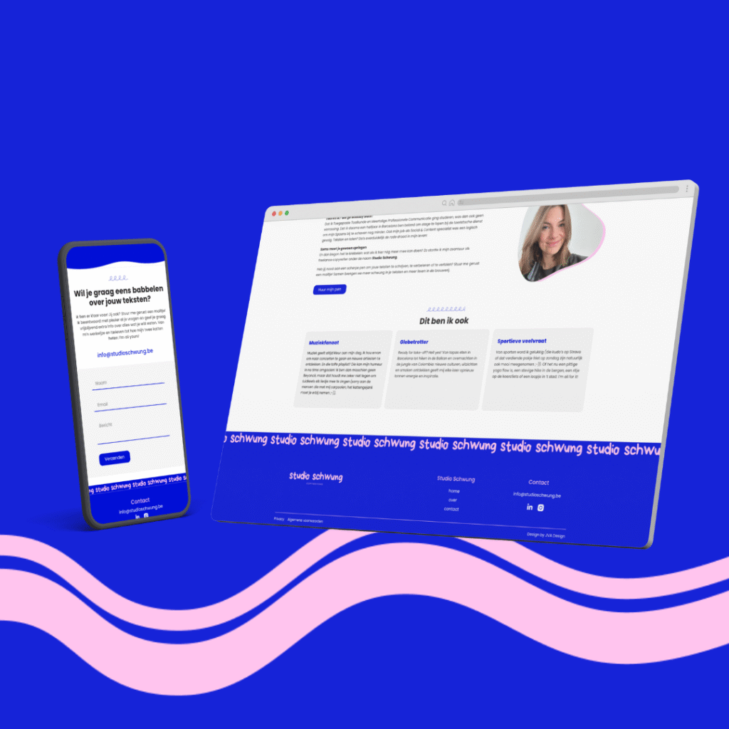 Voor Studio Schwung, een creatieve freelance copywriter, ontwikkelden we de opzet van een moderne website die de professionaliteit en het unieke karakter van de studio weerspiegelt. Het project omvatte design en development, met een focus op duidelijkheid, gebruiksvriendelijkheid en SEO-optimalisatie, zodat potentiële klanten snel de diensten van Studio Schwung kunnen vinden en begrijpen. De website biedt een overzichtelijk overzicht van de aangeboden copywritingdiensten en de creatieve aanpak van de studio. Met deze digitale basis kan Studio Schwung zichzelf online effectief profileren en nieuwe opdrachten aantrekken.